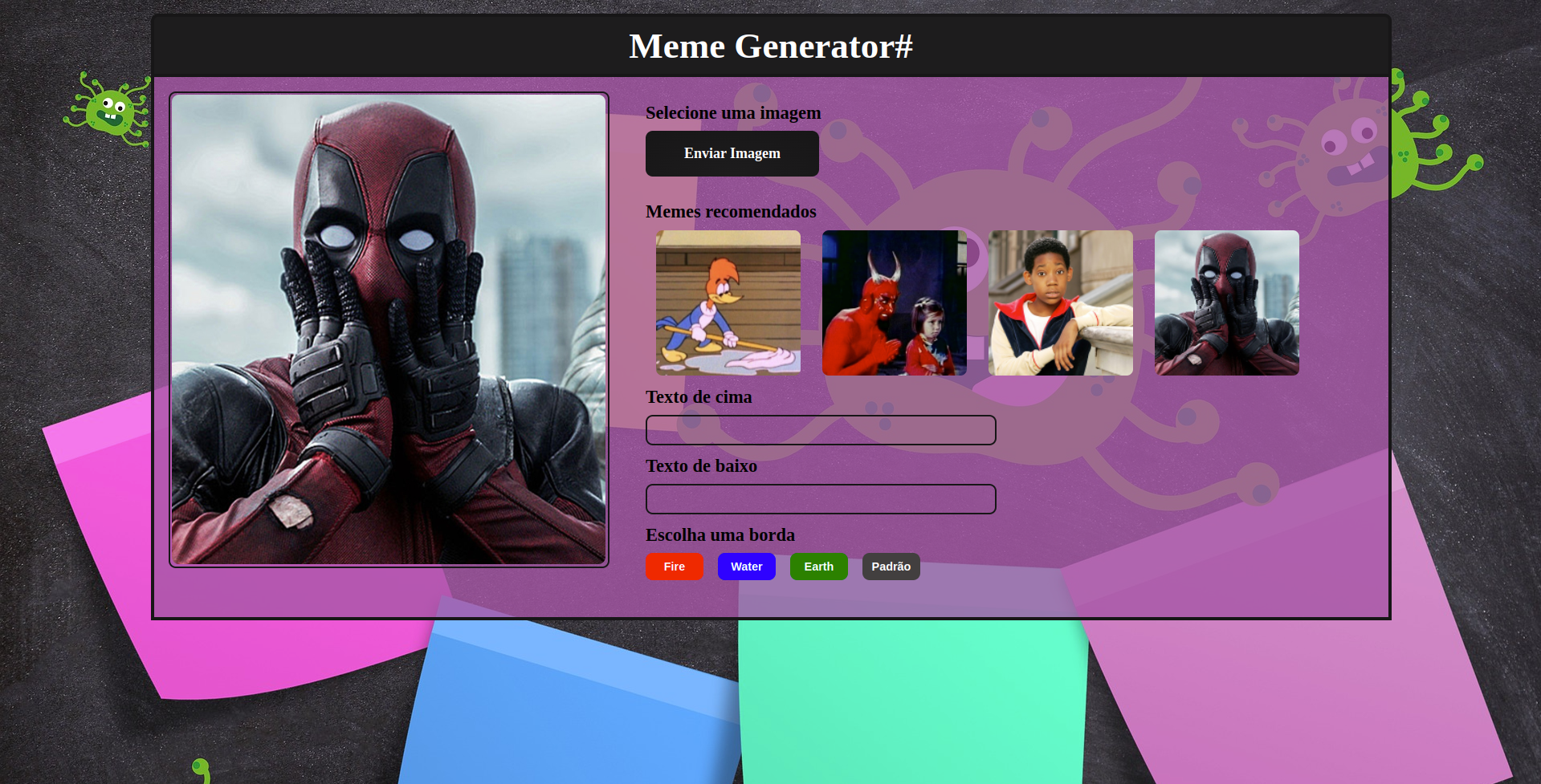 Neste projeto o usuario pode criar memes a partir de imagens que ele possua, ou pode utilizar imagens pré definidas dentro do projeto.